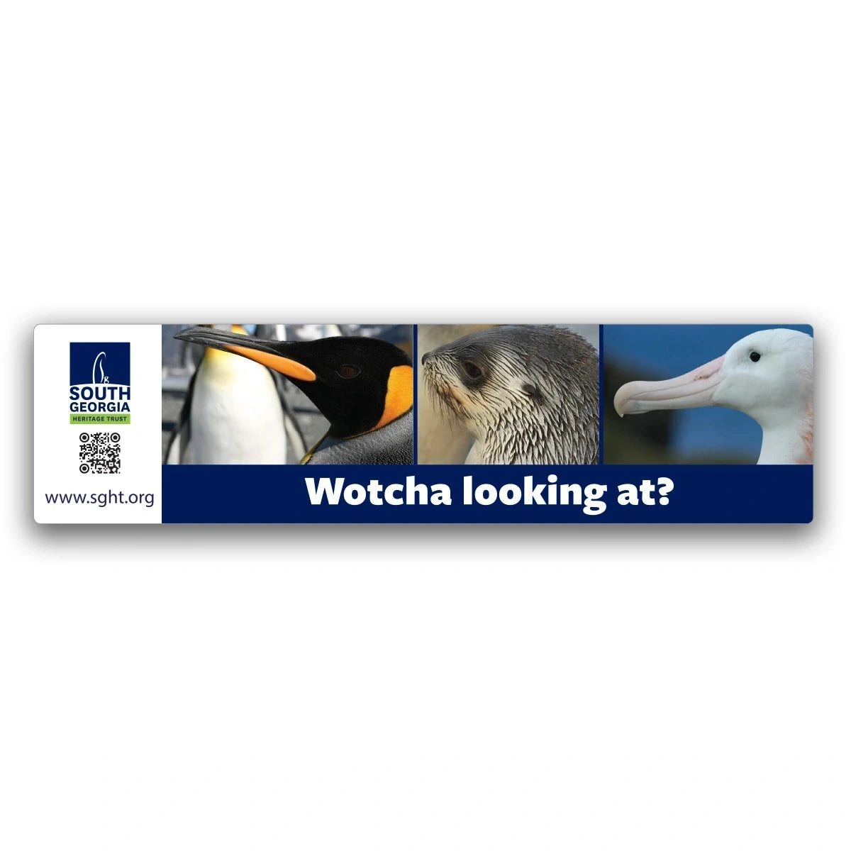 Option 1: 3 images of some of the wildlife found on South Georgia (penguin, seal and albatross) with the amusing caption "What you looking at?" and the SGHT logo; OR