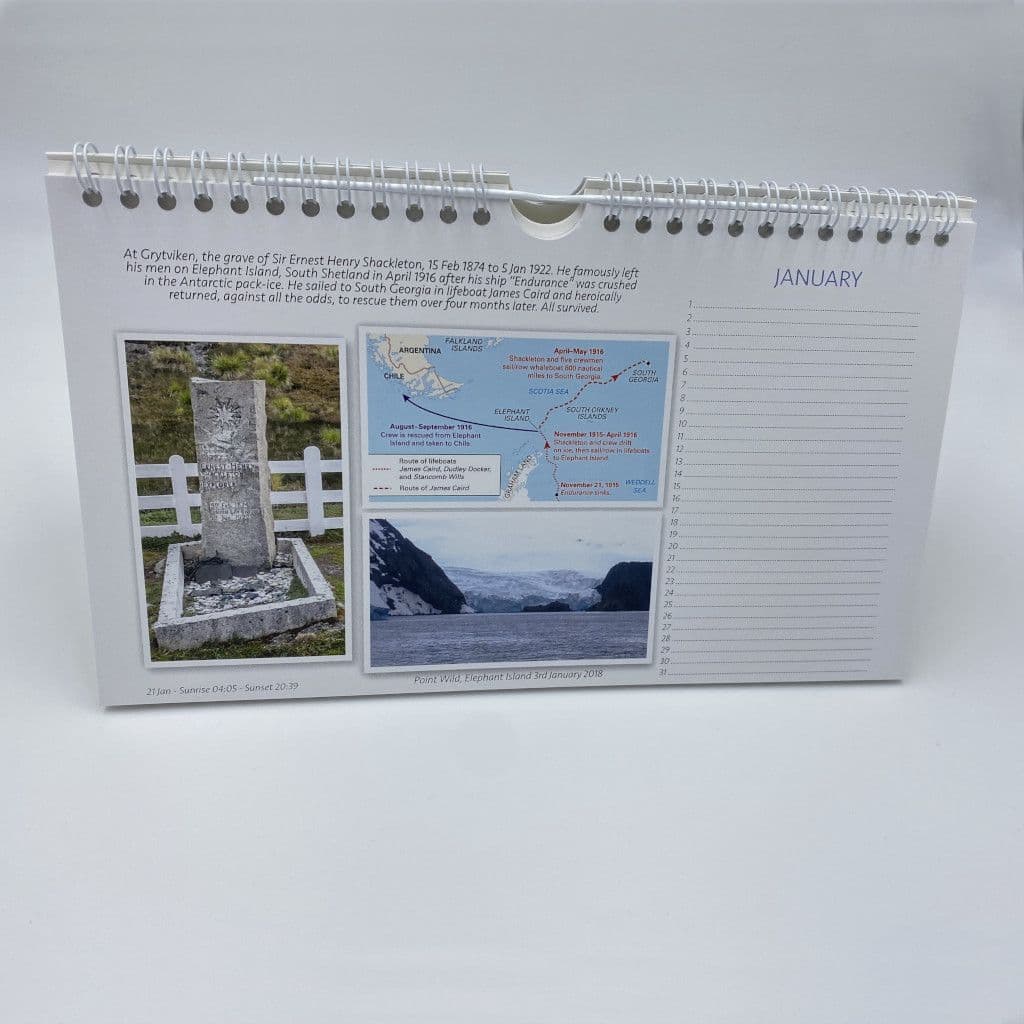 The calendar can be desktop or wall-hung. Each page shows the month and dates only so it can apply to any year and is ideal as a birthday and anniversary calendar. There is a South Georgia related 'story' on each page and a map of South Georgia on the back page highlighting areas where the photos were taken.