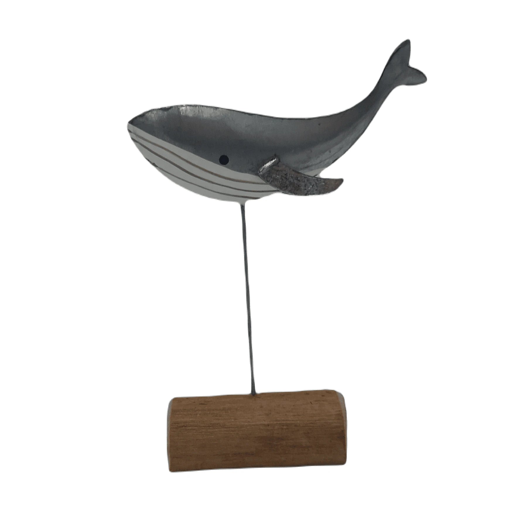 A lovely ornament comprises of a single swimming whale mounted on a section of driftwood.