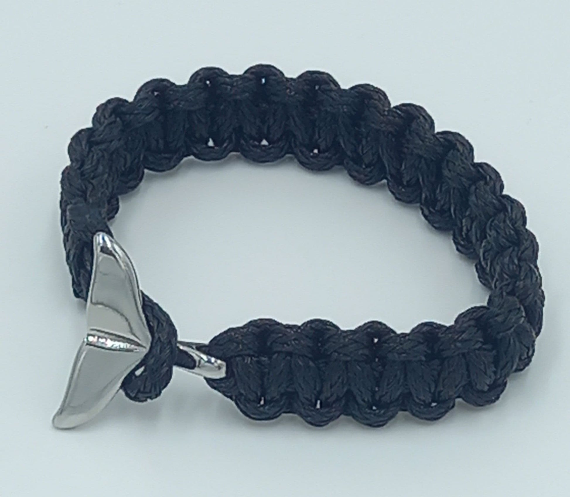 This stylish black recovered whale tail bracelet is made of 316LL marine stainless steel and has a strap made of recovered sterilised 3mm PE braid trawl net.